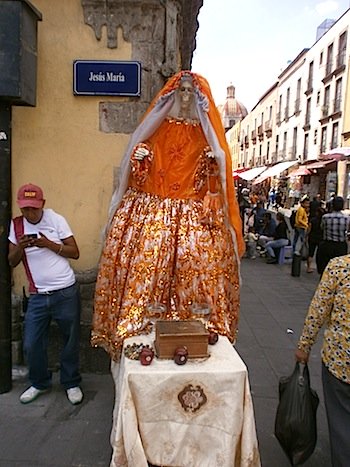 目の前には来るたびにドレスの色が違う、オシャレなサンタ・ムエルテ像