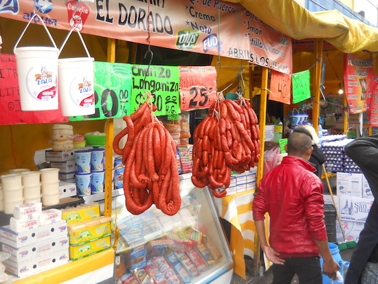 吊るされたロンガニサ=ソーセージは、赤すぎて作り物みたいに見えます。