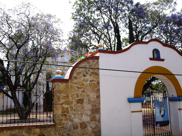 約1時間で到着。ハカランダが散りかけの村のカテドラル。