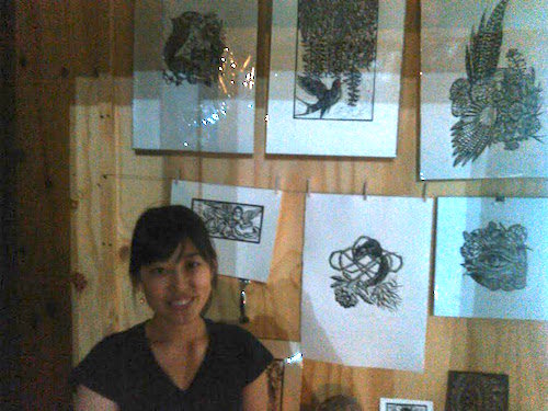 後ろの版画は彼女の作品で、オアハカに暮らし製作活動をしています。