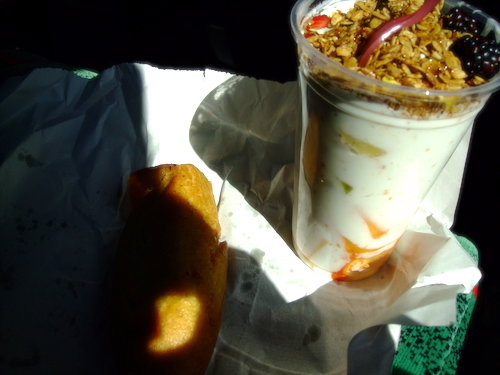 駅前の屋台でフルーツ入りヨーグルトとタマレス。
