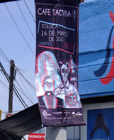 窓から見えたカフェ・タクーバの公演告知バナー。