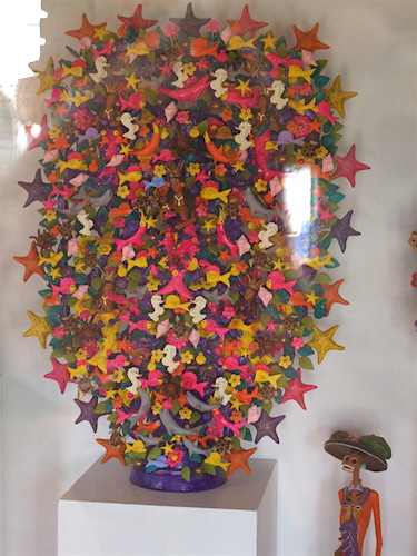 メキシコ中にあるお土産店や民芸品店で売られる生命の樹は、ほぼこのメテペックで生産されています。土の色とカラフルな色がミックスされたスタイルです。