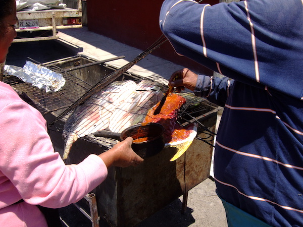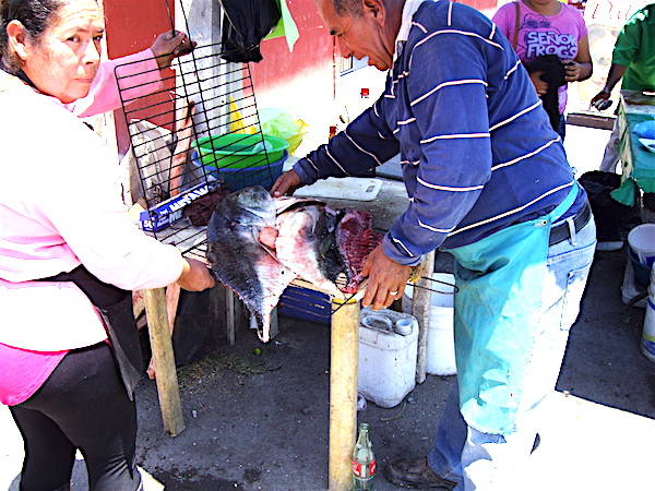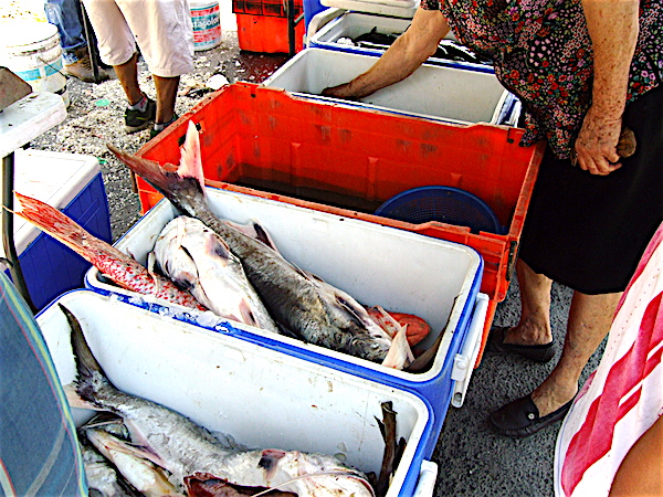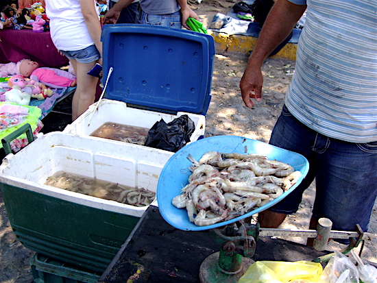 魚介が豊富。 エビ(でかい)の量り売り屋台。