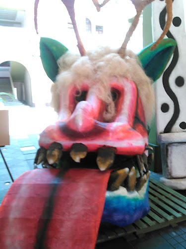 エントランスにいきなり特大のコラ族の仮面がドーンと!