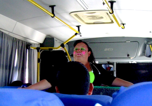 巨漢女性姉妹のクラウンコントが始まる車内。ローカルバスならでは?