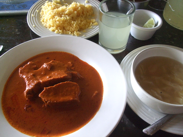 35ペソ(210円)のコミダコリーダ。豚肉のカカワテ(ピーナッツ)ソース。