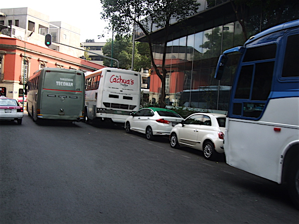 ブカレリ通りにたくさんのバス。メキシコ各地のナンバープレート。
