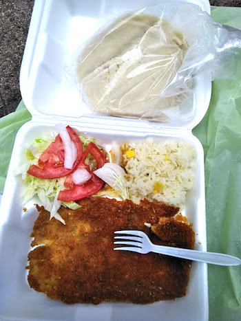 売り切れが多く、ミラネサ(鶏肉のカツレツ)のコミダセット。50ペソ(約300円)