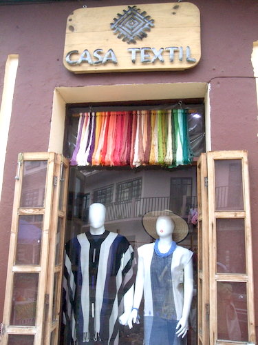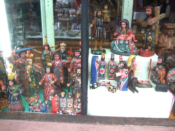 ショウウィンドウに並ぶグアテマラ産の木彫り人形。