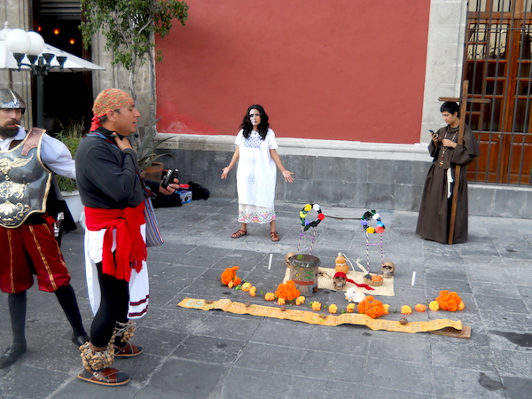 カテドラルの裏手で路上演劇の練習を見学。これも死者の日に向けてですね。
