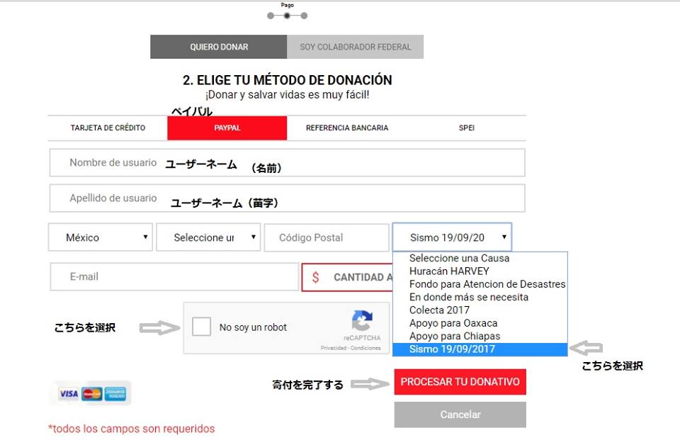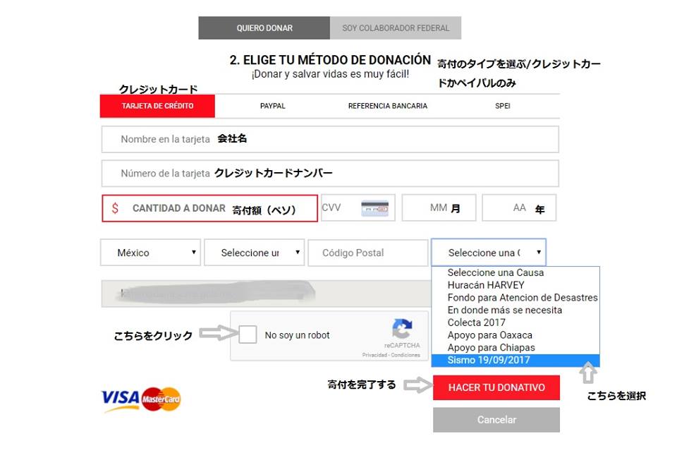 2、クレジットカードかペイパルの支払いを選択し必要情報を入力、寄付金額を入力する(メキシコペソになります。1000円=170ペソ相当)、寄付のあて先(今回の地震の場合はSISMO 19/09/17を選択ください(ステップ2を参照)